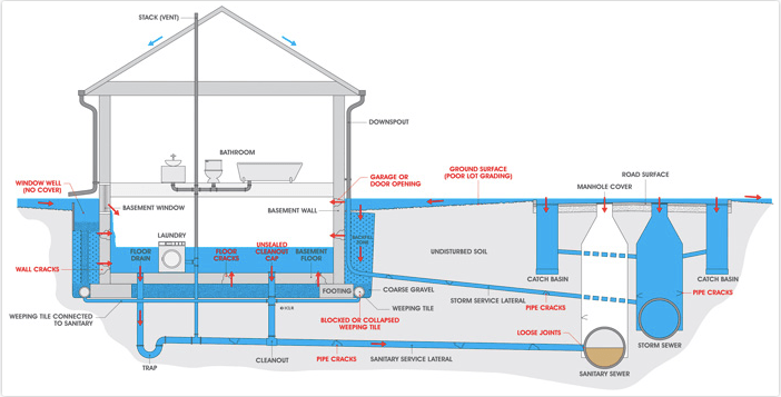 Basement flooding does happen for reasons other than significant precipitation, to include seepage or flow through the walls or foundation floor, surface water sources or by a sanitary or storm sewer backup. Poor lot grading, an unmaintained foundation and problems with pipes may contribute to flooding.